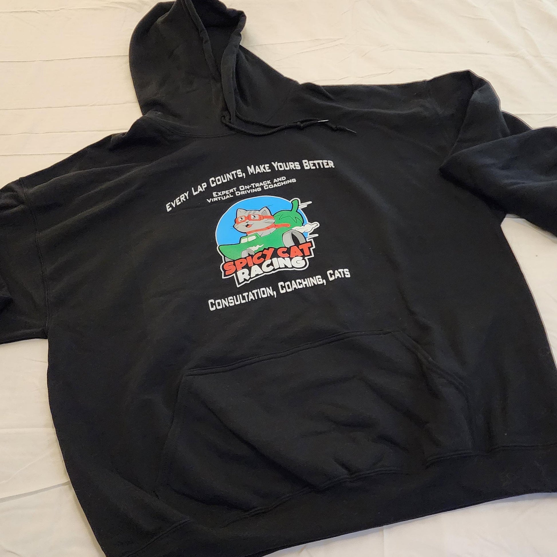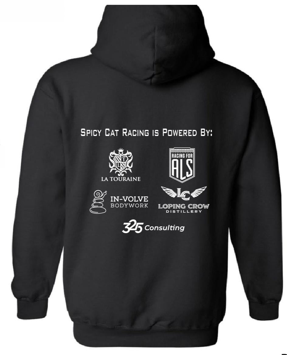 Comfy and cozy Gildan hoodie with the Spicy Cat Racing Logo and sponsor info on the back